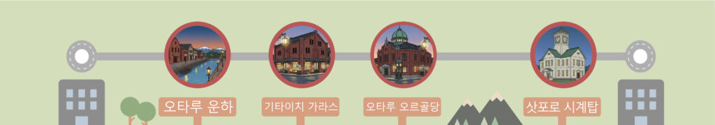 호텔 -> 오타루로 이동 -> 오타루 운하 -> 기타이치 가라스 -> 오타루 오르골당 -> 삿포로로 이동 -> 삿포로 시계탑(차창) -> 호텔