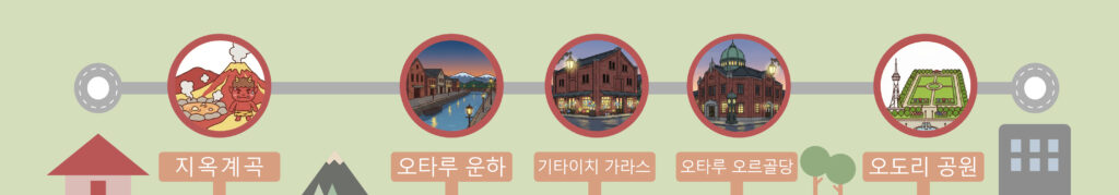 온천 호텔 -> 지옥계곡 -> 오타루로 이동 -> 오타루 운하 -> 기타이치 가라스 -> 오타루 오르골당 -> 삿포로로 이동 -> 오도리 공원 -> 호텔